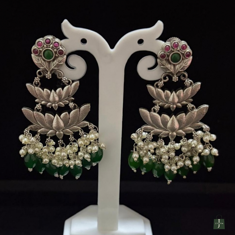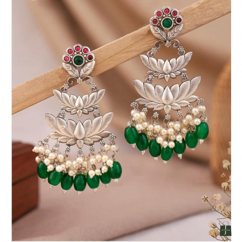 Embrace the timeless allure of The Emerald Lotus. These exquisite earrings feature a tiered lotus motif crafted in high-quality oxidized silver, symbolizing purity and rebirth. Each petal is meticulously detailed to catch the light, while a cascade of delicate seed pearls and vibrant emerald-green glass drops adds a touch of royal movement. A perfect statement piece that bridges the gap between traditional heritage and modern bohemian grace."