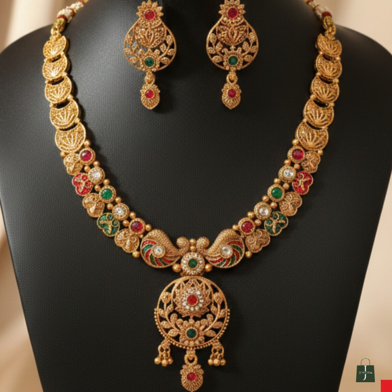 Embrace timeless grandeur with the Royal Mayura Mandala Set, featuring a majestic peacock-inspired centerpiece. This antique gold-tone necklace is uniquely crafted with a textured coin-style band and vibrant ruby and emerald-colored stones. Finished with intricate filigree and matching regal earrings, it is the quintessential statement piece for grand weddings and festive celebrations.