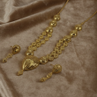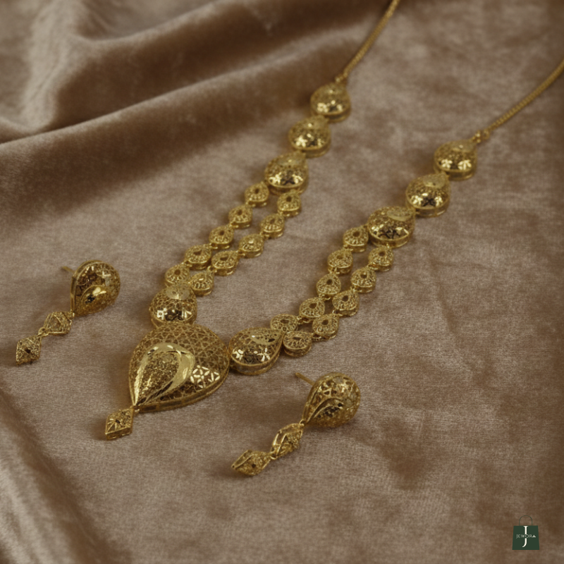 Embrace breathtaking artistry with the Gilded Filigree Teardrop Set, a masterpiece of delicate open-work gold-tone design. This ensemble features intricate lattice-patterned links that taper gracefully into a magnificent teardrop-shaped focal pendant. Paired with matching statement earrings that mirror the airy filigree detail, it is the perfect blend of traditional grandeur and modern elegance.