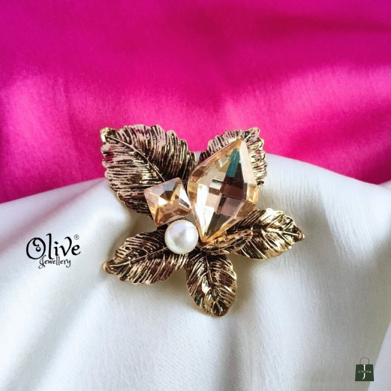Add timeless elegance to your look with the Golden Petal Crystal Floral Brooch Pin. This sophisticated floral brooch features beautifully textured gold-tone petals, highlighted with a dazzling champagne-coloured crystal and a delicate pearl accent at the center. The intricate leaf detailing and premium gold polish give this piece a luxurious charm, making it perfect for both festive occasions and refined everyday styling.