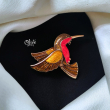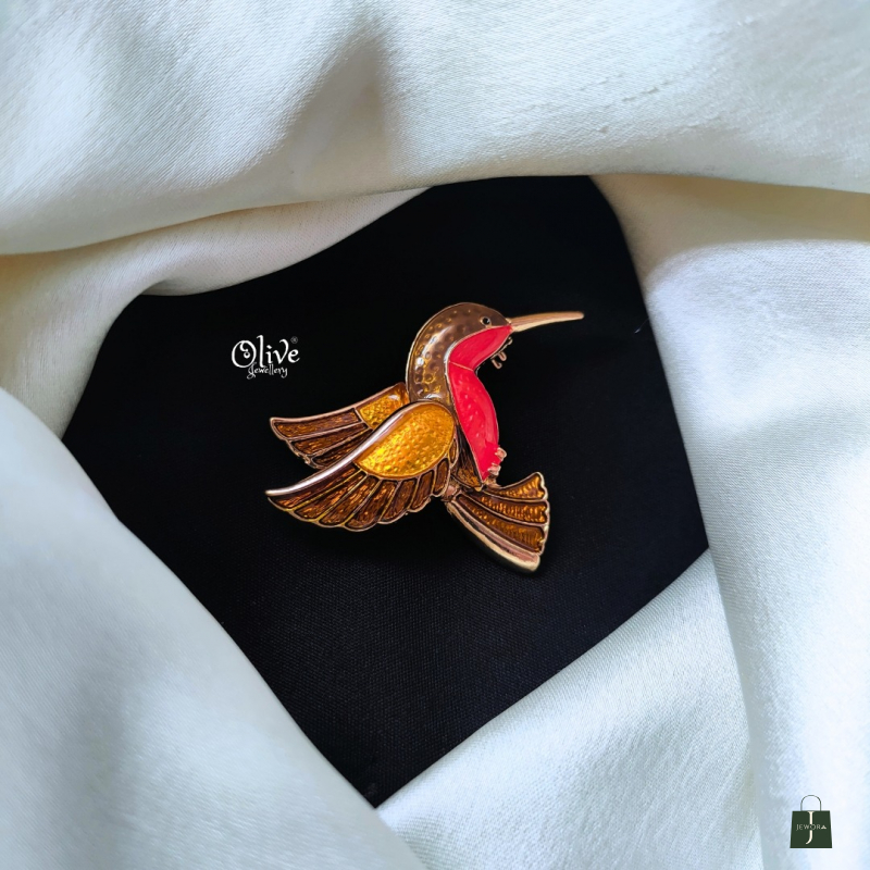 Add a graceful sparkle to your look with the Golden Hummingbird Brooch Pin. Inspired by the beauty of a hummingbird in flight, this brooch features rich amber and honey-yellow enamel wings with a vibrant red accent body. The fine gold-polished outline enhances the sculpted feather detailing, making it a timeless statement accessory for both casual and formal outfits.