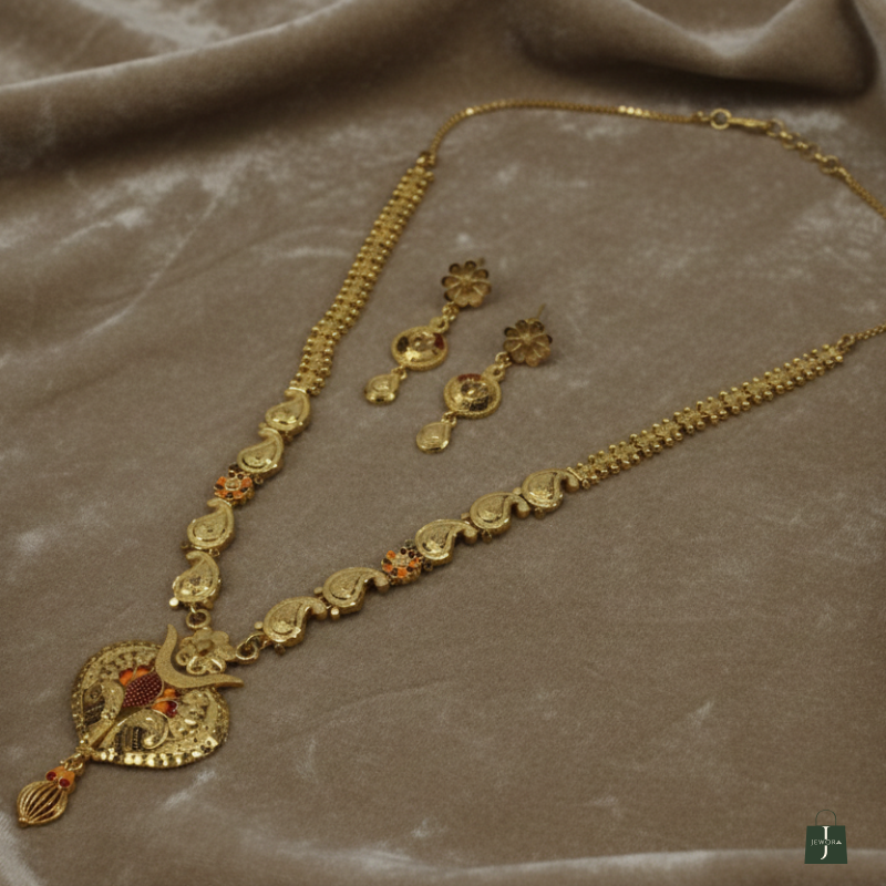 Embrace timeless sophistication with the Royal Paisley Heritage Mala, a stunning tribute to traditional craftsmanship. This gold-tone set features a graceful chain of intricate paisley motifs leading to a magnificent, filigree heart-shaped pendant. Paired with matching floral-drop earrings, this ensemble offers a perfect blend of regal charm and delicate detail for any grand occasion.