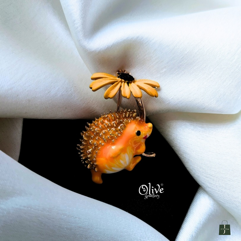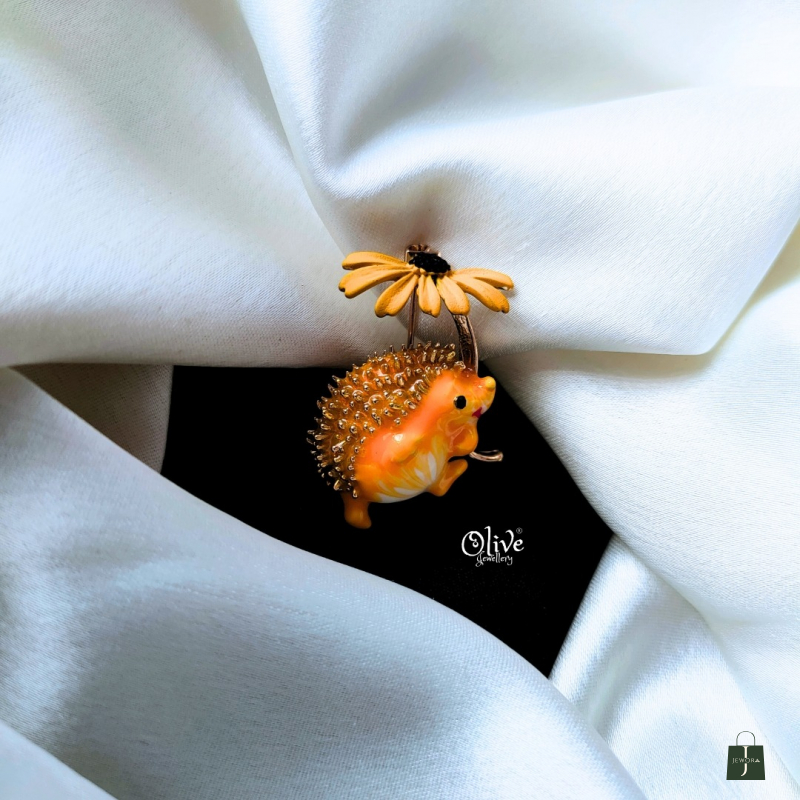 Bring a touch of playful charm to your accessories with the Sunny Hedgehog Charm Brooch Pin. This adorable brooch features a cute hedgehog design hanging beneath a daisy flower motif. Crafted with glossy enamel in warm yellow and orange tones, and detailed with tiny crystal-textured spikes, this piece adds a fun yet elegant vibe to your outfit. Perfect for animal lovers and those who enjoy quirky statement jewelry.