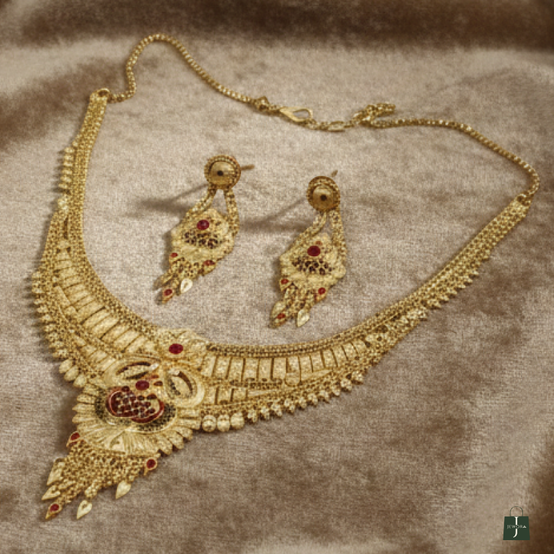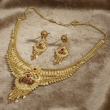 Experience regal splendor with the Imperial Maharani Choker, a masterpiece of gold-tone craftsmanship. This set features a broad, textured collar adorned with a central heritage motif and subtle ruby-toned accents. Finished with shimmering golden fringe and matching statement earrings, it offers a grand, high-impact look perfect for weddings and festive celebrations.
