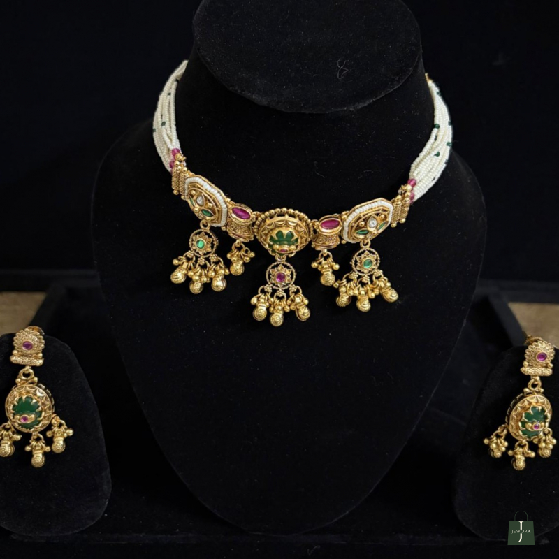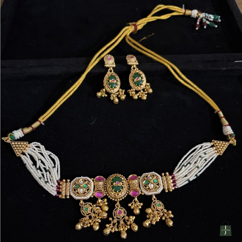 Step into a world of timeless elegance with this exquisite handcrafted choker set. Designed for the woman who carries herself with the poise of a modern-day queen, this piece is a masterclass in traditional Jadau-inspired artistry.