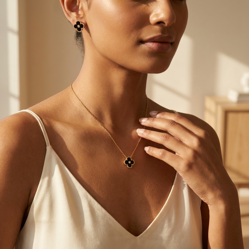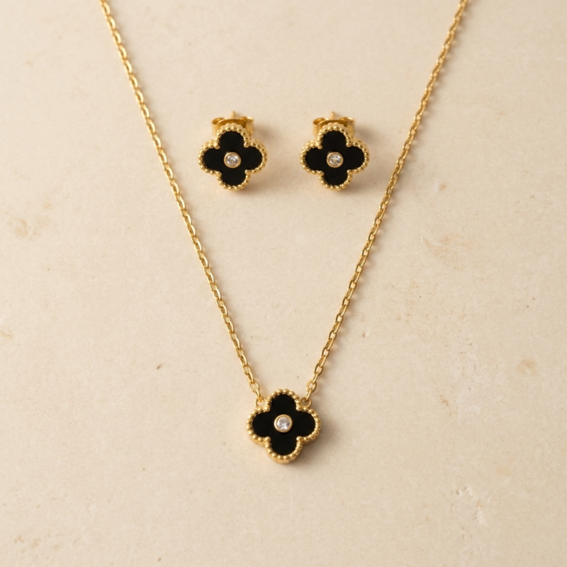 Celebrate sophisticated charm with our Midnight Clover Set. Inspired by classic floral motifs, this set includes a delicate pendant necklace and matching stud earrings, each featuring a beautifully polished black onyx-tone inlay framed by radiant, beaded gold detailing. At the heart of each clover lies a sparkling, precision-set crystal that catches the light with every move.
