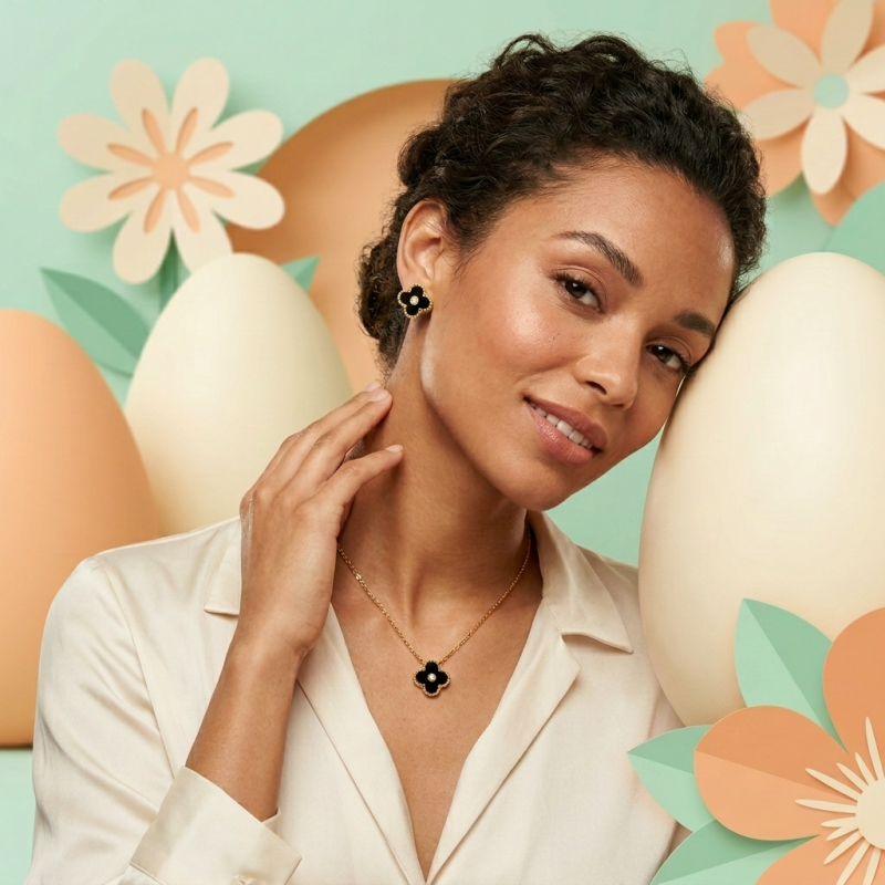 Design: Iconic clover motif with black stone-tone inlay and beaded gold edges.