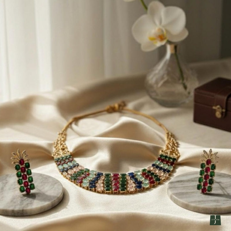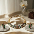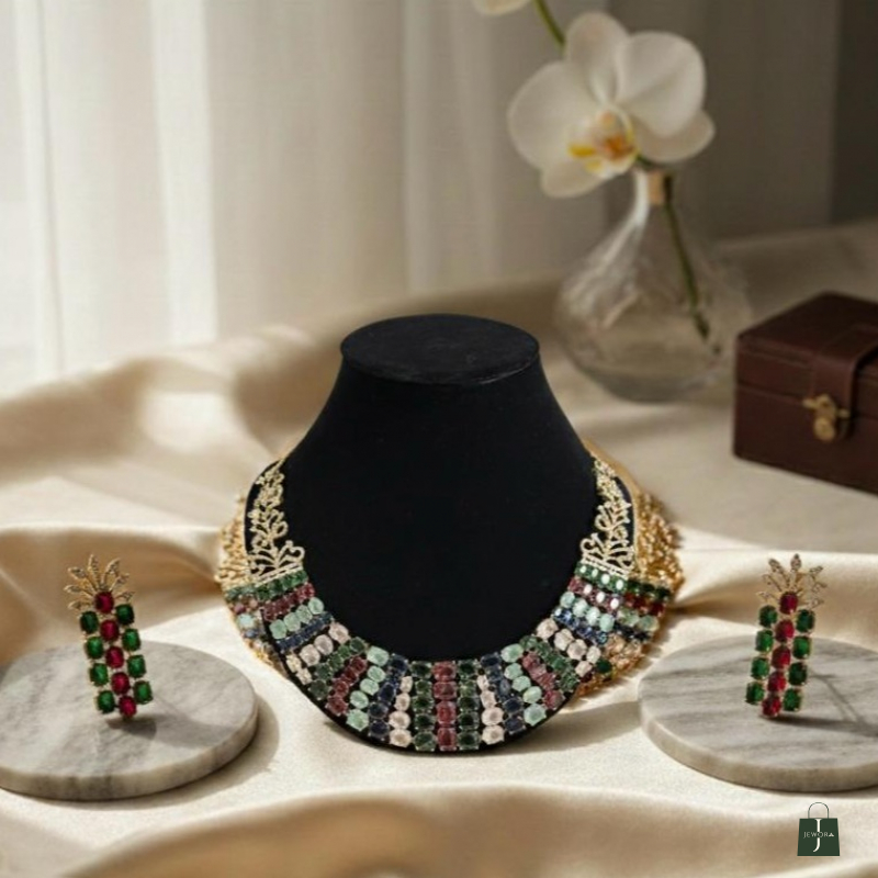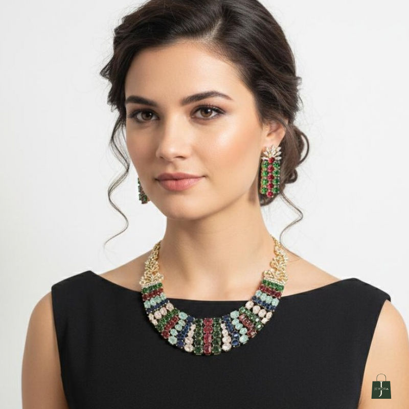 Inspired by the lush, rain-washed landscapes of a royal garden, The Monsoon Meadow is a vibrant celebration of nature’s most vivid colors. This multi-layered bib necklace is designed for the woman who loves to make a bold, artistic statement while staying rooted in feminine
