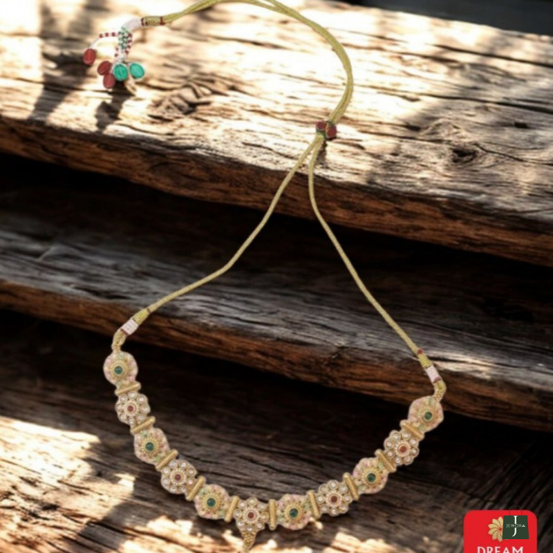 Exude graceful charm with the Pastel Petal Harmony Choker, a delicate fusion of traditional and modern artistry. This antique gold-tone necklace features a row of intricate floral links accented with soft pink enamel and vibrant ruby-green stones. Complete with an adjustable golden cord for a perfect fit, it is an elegant choice for festive daywear.