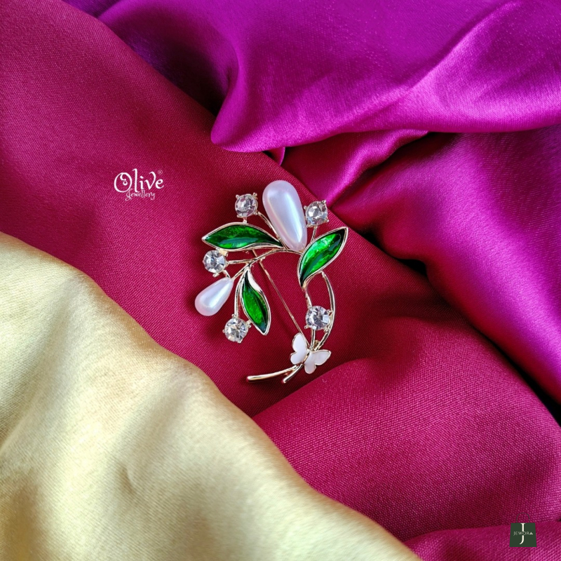 This elegant brooch features a graceful floral and leaf-inspired design crafted in a gold-tone finish. Adorned with luminous white pearl drops, vibrant emerald-green stones, and sparkling clear crystal accents, it beautifully blends nature with sophistication. A delicate butterfly detail adds a charming touch, making this brooch perfect for formal wear, festive occasions, weddings, or elegant everyday styling. Wear it on sarees, dresses, scarves, blazers, or shawls to instantly elevate your look.