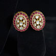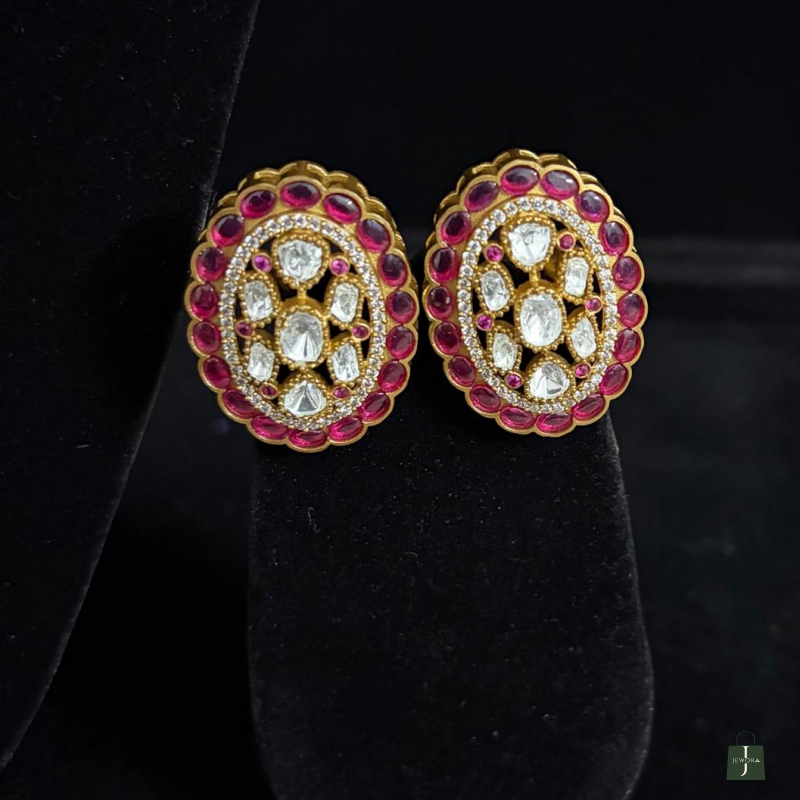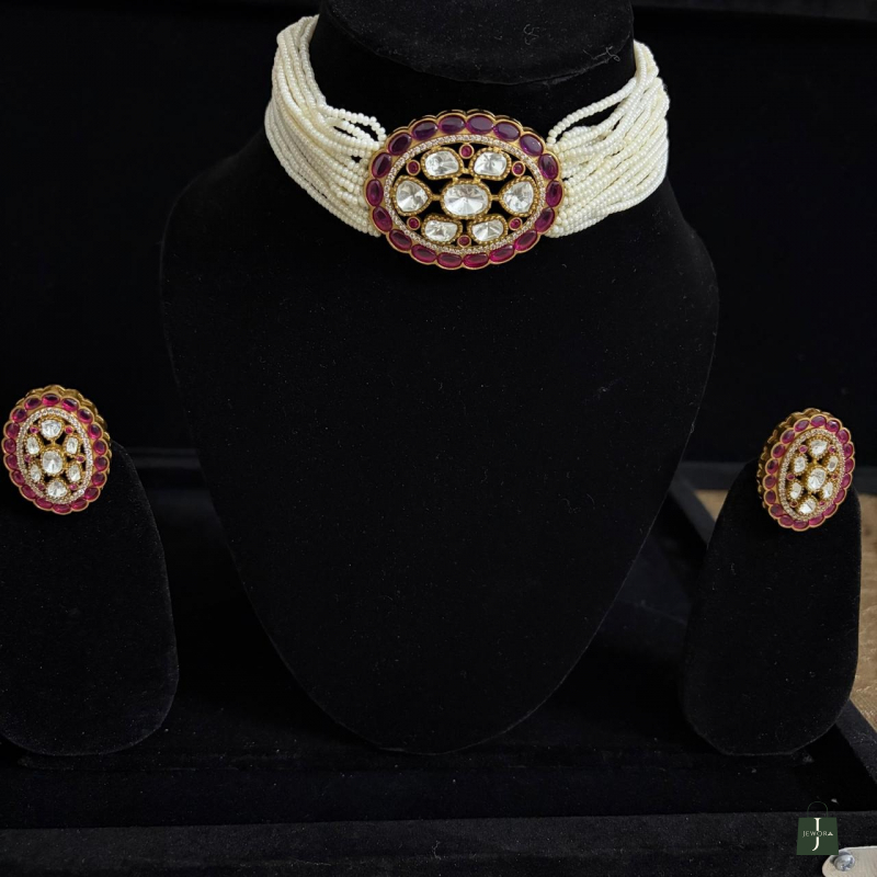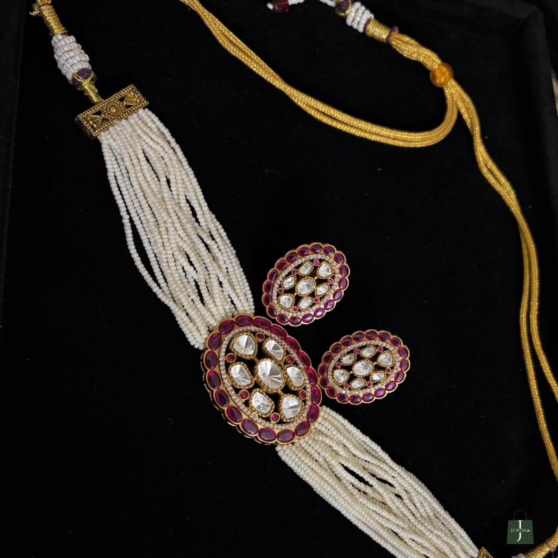 Reclaim the grandeur of the royal courts with this masterpiece of traditional craftsmanship. This choker features thirteen delicate strands of luminous seed pearls, gathered by a breathtaking oval centerpiece. Encrusted with hand-set crimson rubies and uncut Polki diamonds, the floral-inspired motif captures the light with every movement. Accompanied by a matching statement ring, this set is designed for the woman who carries her heritage with effortless