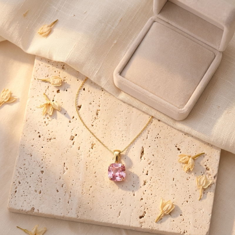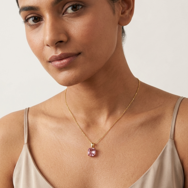 A masterpiece of soft color and sophisticated cut, the Rose Cushion Solitaire is designed for the woman who loves understated luxury. This elegant necklace features a premium, cushion-cut crystal in a delicate "Petal Pink" hue, held by a sleek, tapered gold bail. Nestled in its signature velvet box, it arrives ready to be the center of your jewelry collection.