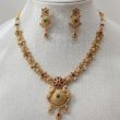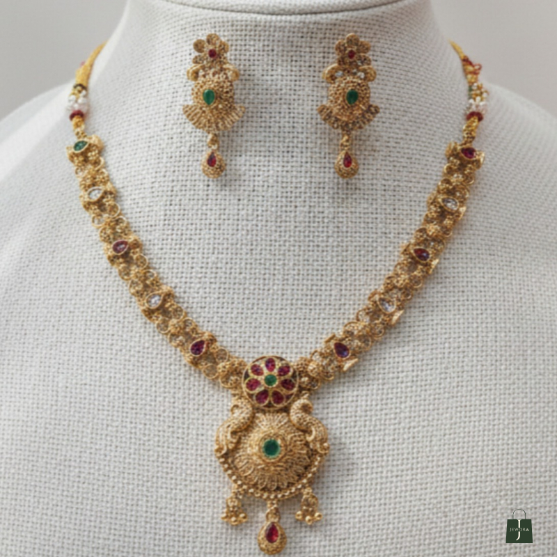 Capture the essence of traditional grace with the Royal Mayura Crest Set. This antique gold-tone choker features a majestic peacock-inspired pendant intricately set with vibrant ruby and emerald-colored stones. Detailed with fine filigree and delicate gold droplets, this regal ensemble is the perfect statement piece for grand weddings and festive celebrations.