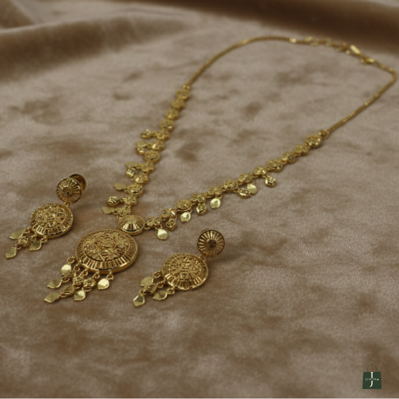 Illuminate your look with the Royal Mihira Sunburst Set, a masterpiece of radiant gold-tone artistry. This ensemble features a sun-inspired central medallion complemented by a chain of delicate floral-wheel links. Finished with shimmering leaf-shaped charms and matching circular earrings, it captures a sense of celestial grandeur perfect for weddings and prestigious celebrations.
