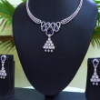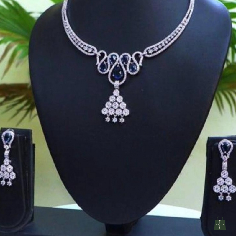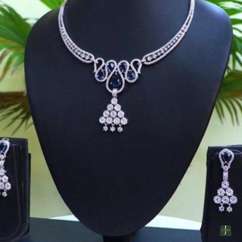 A symphony of geometric precision and fluid grace, The Sapphire Cascade is designed for high-glamour evenings. The necklace features a unique "wave" collar that leads to a central focal point of deep indigo pear-cut stones. Suspended beneath is a dazzling, tiered triangular pendant that mimics the shimmering fall of water. The matching earrings echo this chandelier effect, creating a balanced, high-impact look that frames the face with cool-toned brilliance.