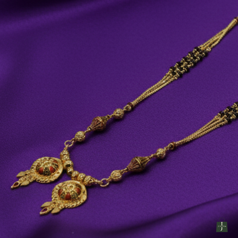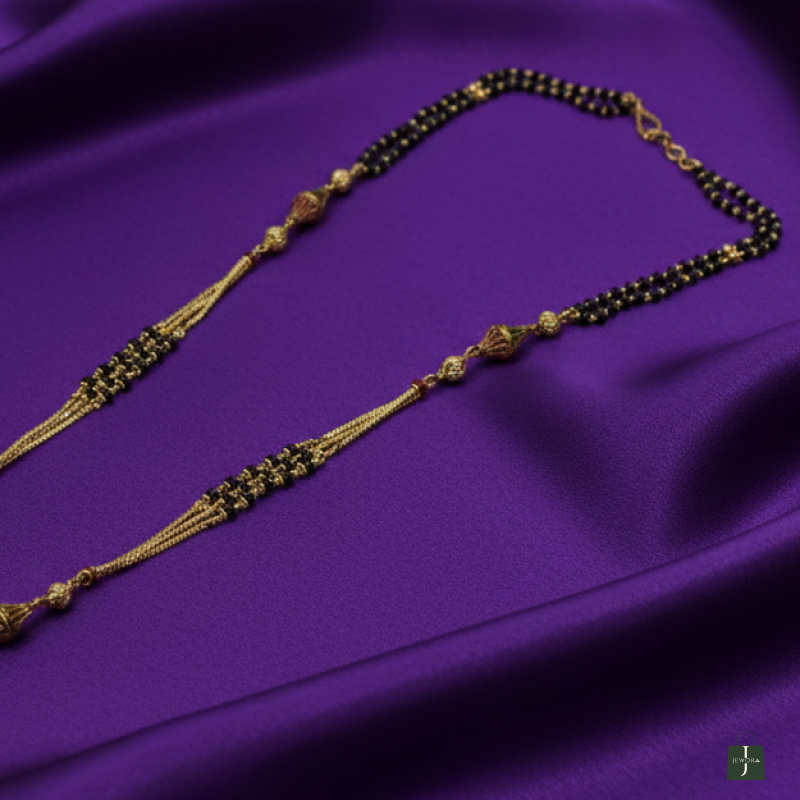 Embrace sacred tradition with this stunning double-pendant mangalsutra. This exquisite piece features a triple-strand gold chain detailed with unique conical spacers and auspicious black beads. The dual circular filigree pendants, inspired by the classic "Wati" style, symbolize a blessed union, making it a regal and meaningful accessory for the modern woman.