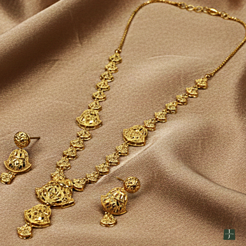 Experience the elegance of traditional artistry with the Royal Filigree Lattice Mala. This gold-tone set features a stunning multi-tiered focal pendant composed of three graduated, hollow-work charms. Crafted with intricate lace-like filigree links, this lightweight yet grand ensemble is paired with matching 3D-effect earrings, making it a sophisticated choice for any gala.