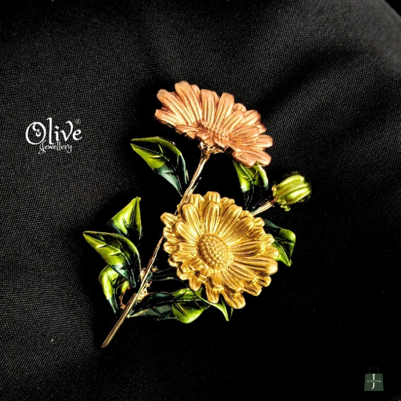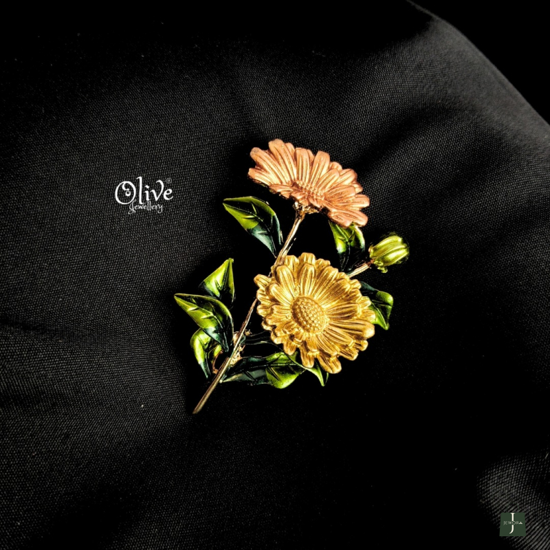 The Golden Garden Bloom Brooch is a beautifully crafted accessory inspired by blooming garden flowers. This elegant design features two layered floral motifs—one in warm golden tones and the other in soft rose-gold—set on a sleek stem with glossy green enamel leaves. The textured petals add depth and realism, giving the brooch a premium handcrafted appearance.
