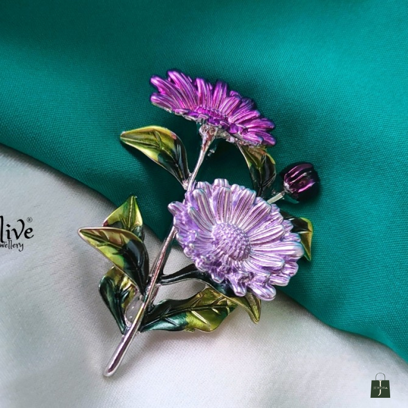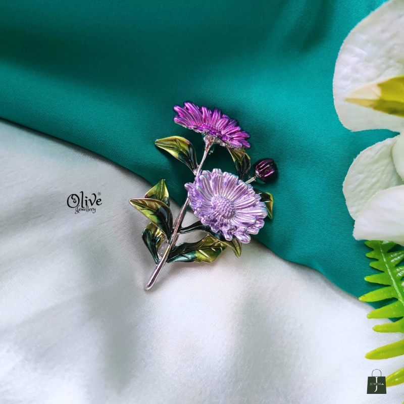 Bring a fresh and graceful charm to your outfit with the Lavender Bloom Floral Brooch Pin. Designed with two beautifully detailed blooming flowers in soft lavender and purple tones, this brooch is complemented by shimmering green enamel leaves and a sleek silver-polished stem. The crystal-like faceted petals reflect light brilliantly, making this piece perfect for both everyday elegance and special occasions.