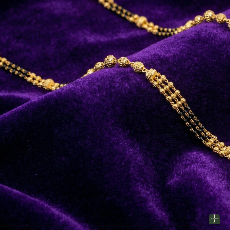 Experience the epitome of royal elegance with the Golden Bloom Mangalsutra. This exquisite piece features traditional dual pendants adorned with intricate petal-like textures and delicate ruby accents. The design is elevated by a luxurious triple-strand chain of golden beads and black accents, harmonizing ancient Maharashtrian heritage with sophisticated, modern craftsmanship for a truly timeless statement.