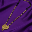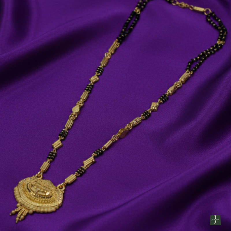 Embrace timeless sophistication with this uniquely designed gold-linked mangalsutra. Featuring a distinctive pattern of structured gold bars interspersed with traditional black beads, this piece leads to a magnificent semi-circular filigree pendant. Finished with delicate gold droplets, it offers a bold yet graceful silhouette, perfect for the woman who values both heritage and modern geometric artistry.