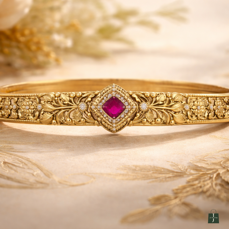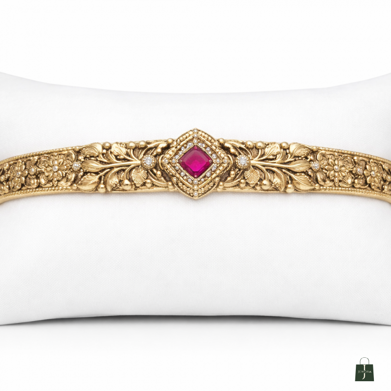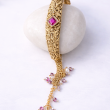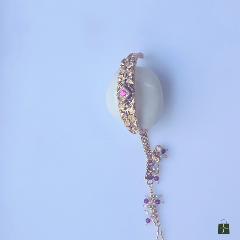 Enhance your ethnic elegance with this antique gold-plated filigree bracelet for women, designed to reflect timeless Indian artistry. The bracelet showcases intricate floral patterns with fine detailing, highlighted by a beautiful pink stone centerpiece that adds a royal touch.