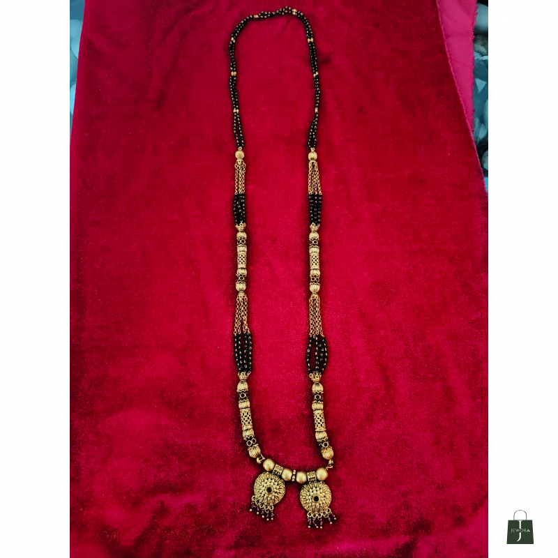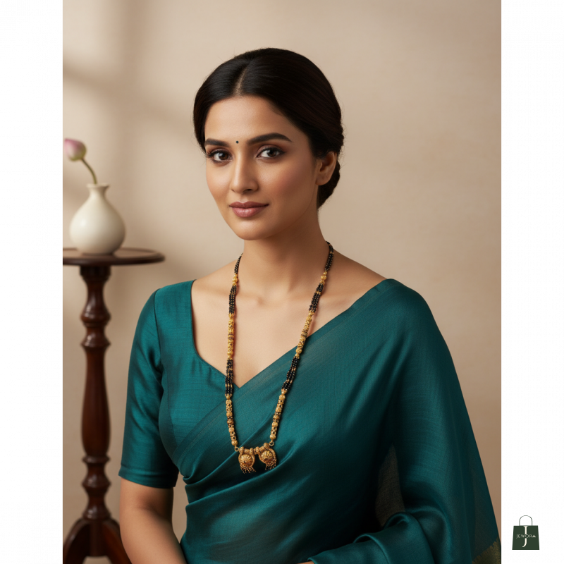This exquisite dual-strand temple-inspired mangalsutra showcases a rich blend of black beads and gold-toned elements, creating a timeless ethnic charm. The pendant features beautifully crafted twin temple motifs with intricate detailing, making it a striking centerpiece. Designed for women who adore traditional artistry, this mangalsutra pairs perfectly with sarees and festive attire, adding elegance and cultural grace to every look.