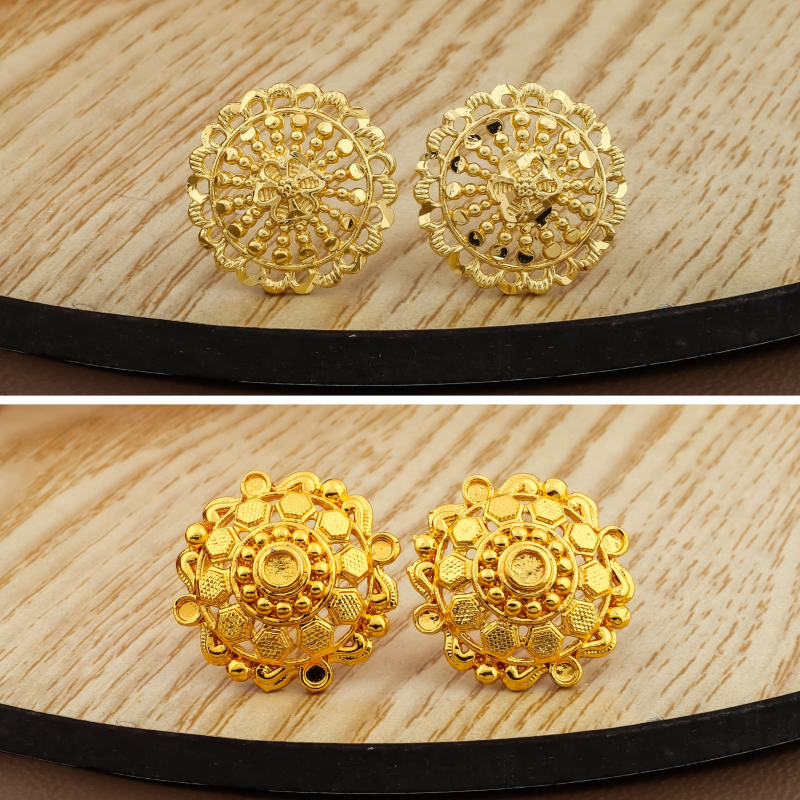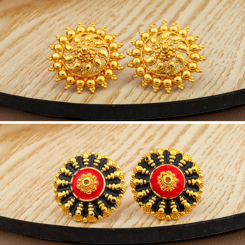 Elevate your jewellery collection with this elegant combo of six pairs of gold-polish stud earrings featuring a variety of traditional and contemporary ethnic designs. The set includes intricate mandala patterns, sunburst motifs, temple-inspired studs, floral textures, enamel detailing, and classic textured designs. Crafted with a rich gold finish and fine detailing, these earrings offer a timeless ethnic appeal while remaining lightweight and comfortable for everyday wear. Perfect for styling with sarees, kurtis, lehengas, and Indo-western outfits, this versatile combo is ideal for both festive occasions and daily use.