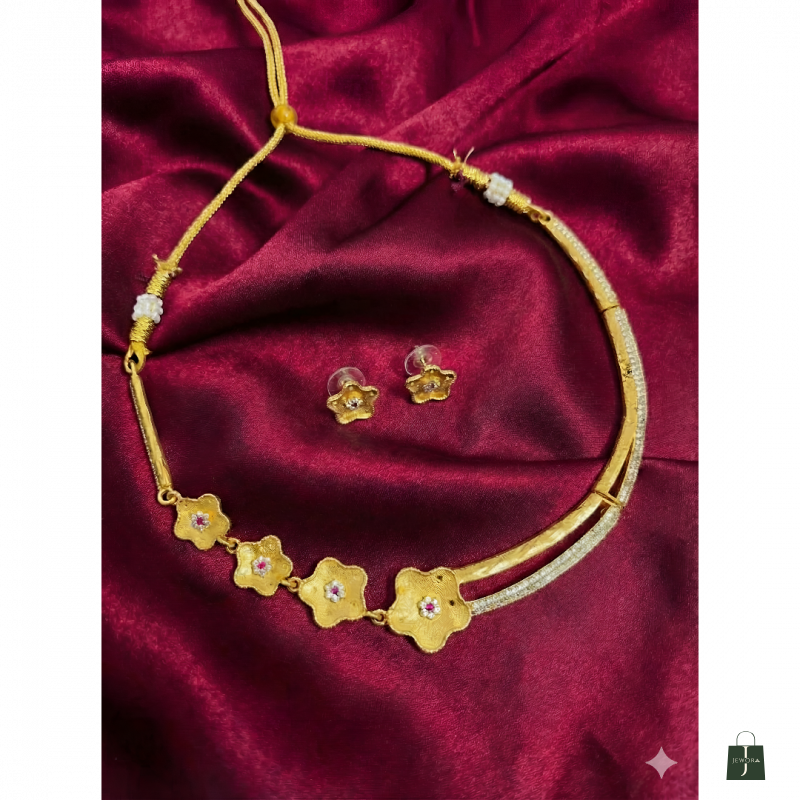 Embrace understated elegance with our Traditional Gold Floral Crystal Stone Jewellery Set, a perfect blend of classic charm and western jewellery for women sophistication. This trending western jewellery set for women stylish collection features delicate five-petal floral designs adorned with sparkling crystal centerpieces. A best seller among minimalist jewelry lovers, this fancy western jewellery for women showcases lustrous gold-tone finish with refined craftsmanship. The western jewellery necklace presents a graceful choker style with evenly spaced floral motifs, making it a limited edition essential for every contemporary wardrobe.
