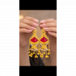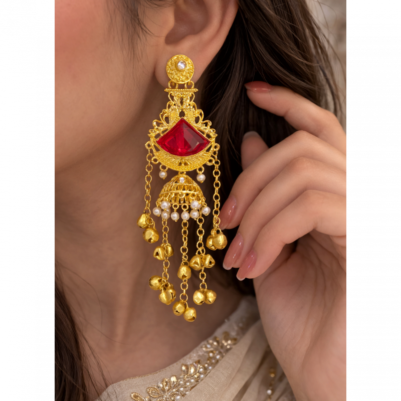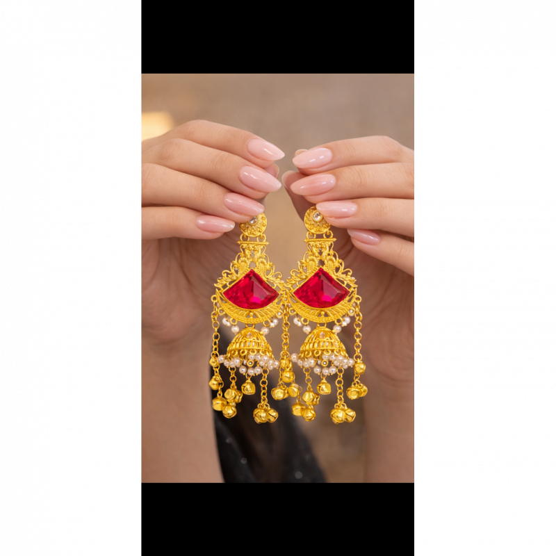 Enhance your ethnic look with these stunning gold-plated chandbali earrings featuring a bold red stone centerpiece and elegant pearl detailing. Intricately designed with hanging ghungroo-style charms, these earrings are perfect for weddings, festive occasions, and traditional wear. Lightweight yet eye-catching, they add a royal touch to any outfit.