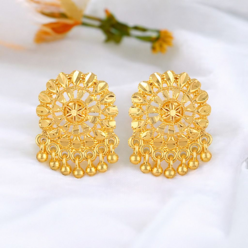 Crafted from premium quality alloy metal with a rich gold polish, these earrings provide a luxurious look while remaining lightweight and comfortable to wear. The intricate carvings and polished petal shapes highlight the fine detailing, making them perfect for festive occasions, weddings, and celebrations.