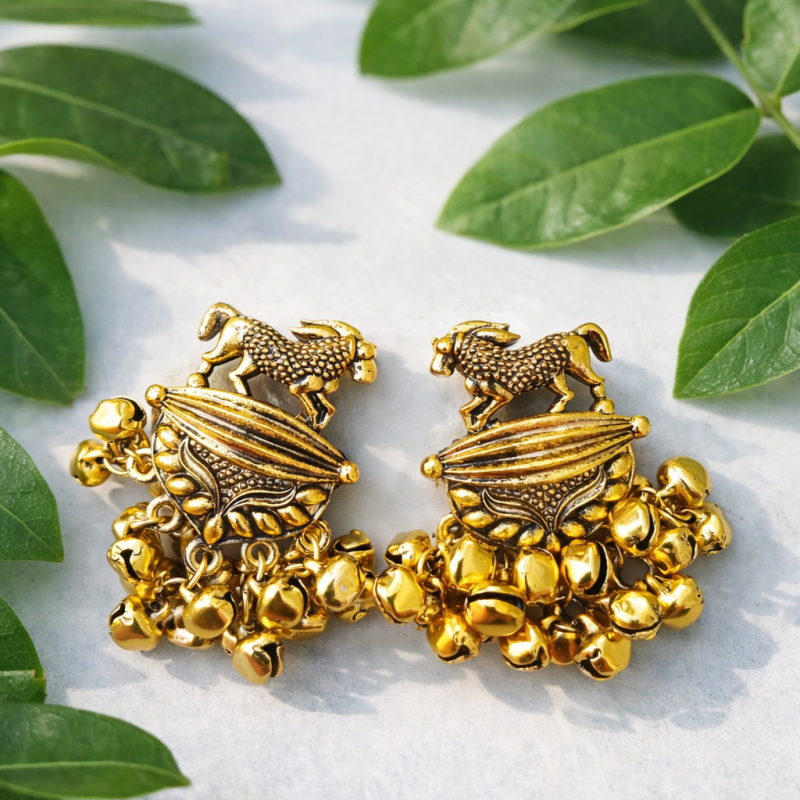 Enhance your ethnic look with these beautifully crafted gold plated jhumka earrings. Featuring a unique antique design with intricate detailing and ghungroo beads, these earrings add a royal and trendy touch to any outfit. Perfect for festive occasions, weddings, and daily wear styling.