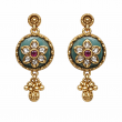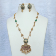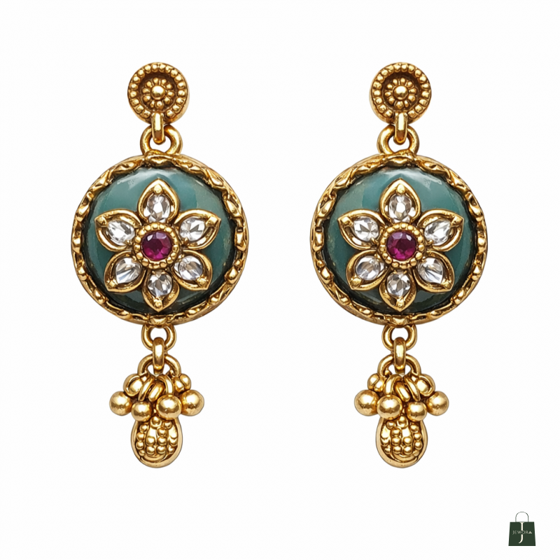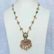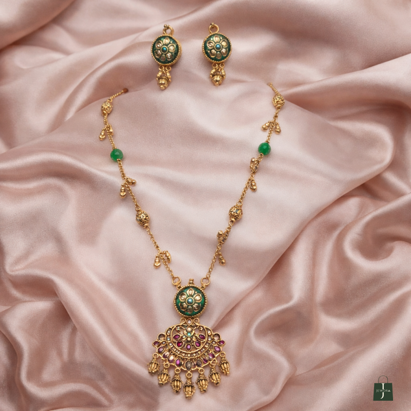 Add timeless elegance to your ethnic look with this Traditional Gold Plated Kundan & Green Enamel Long Necklace Set, designed to reflect rich Indian craftsmanship. This beautifully handcrafted jewelry set features an antique gold-tone finish with intricate kundan stone work, highlighted by green enamel detailing and ruby-colored accents that enhance its regal charm.