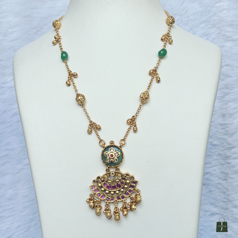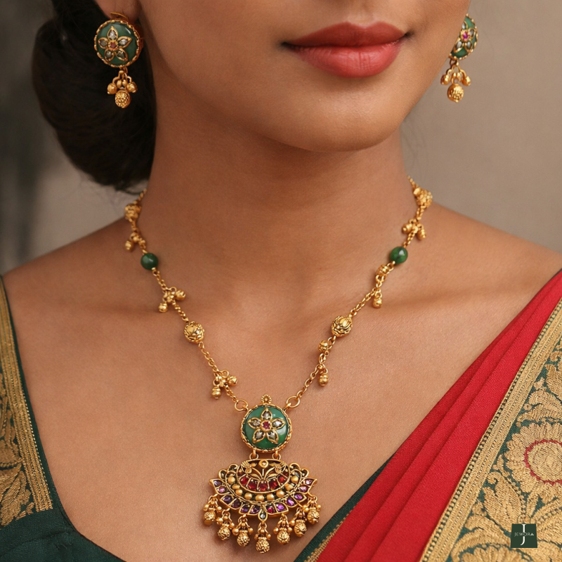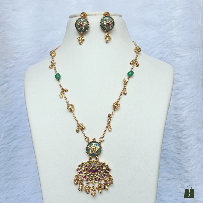Crafted with premium quality materials and superior gold plating, this necklace set is durable, skin-friendly, and designed to retain its shine for long-term use. It also makes a thoughtful gift for weddings, anniversaries, festivals, or special occasions.
