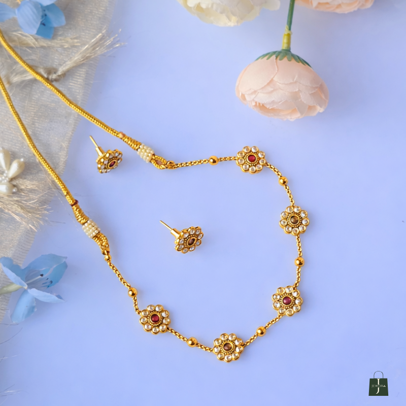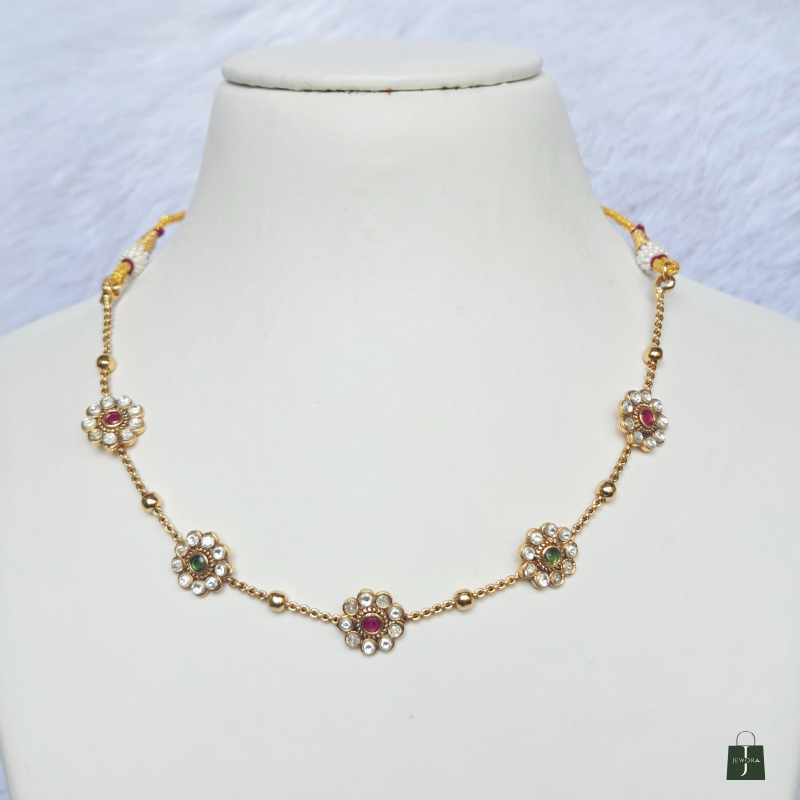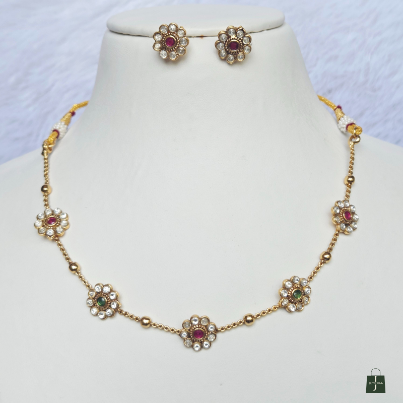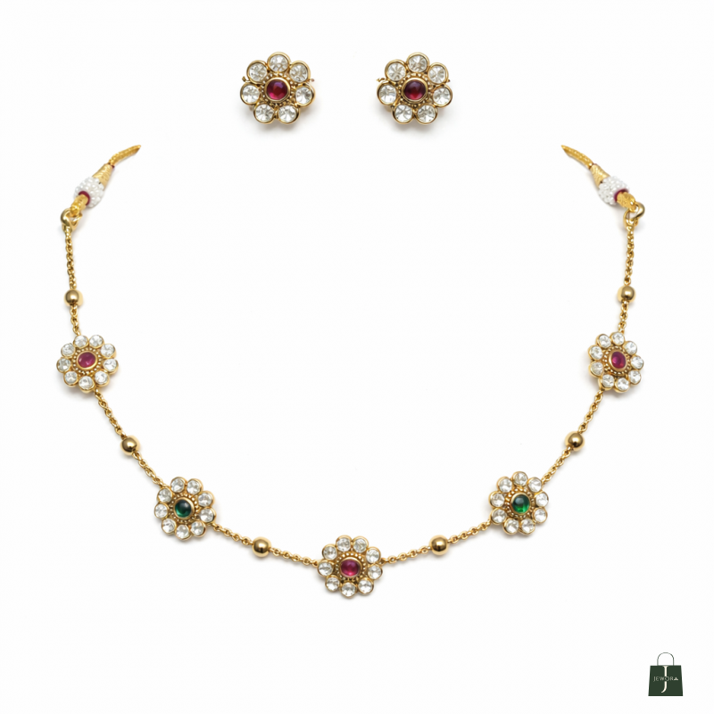 Add timeless elegance to your ethnic collection with this Traditional Gold Plated Kundan Necklace Set, beautifully crafted with floral motifs and multicolor stones. Designed to reflect classic Indian heritage, this necklace features intricately placed ruby-pink and emerald-green stones, surrounded by shimmering white kundan work that enhances its royal appeal.