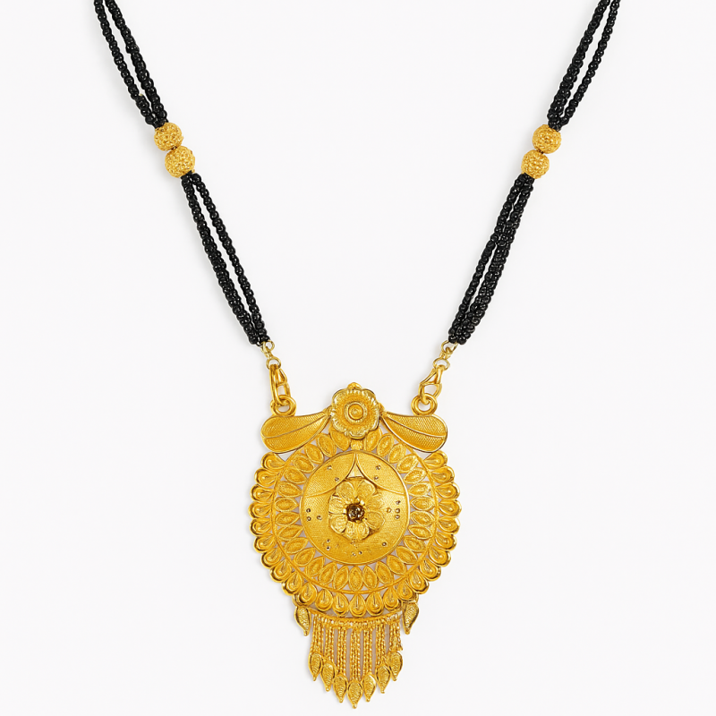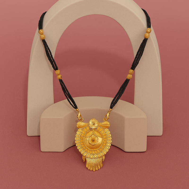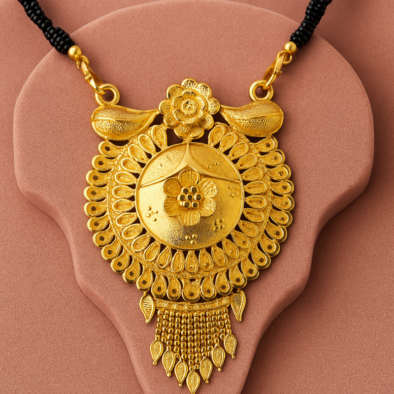 This exquisite Traditional Gold-Plated Multi-Strand Mangalsutra is crafted with timeless elegance, featuring multiple strands of classic black beads interlinked with golden accents. At the center, a grand circular pendant with intricate floral engravings radiates traditional charm and grace. The pendant is further enhanced with fine filigree detailing and golden embellishments, making it a perfect symbol of love and commitment.