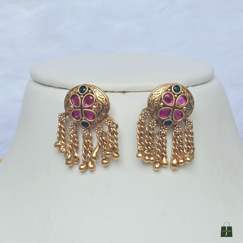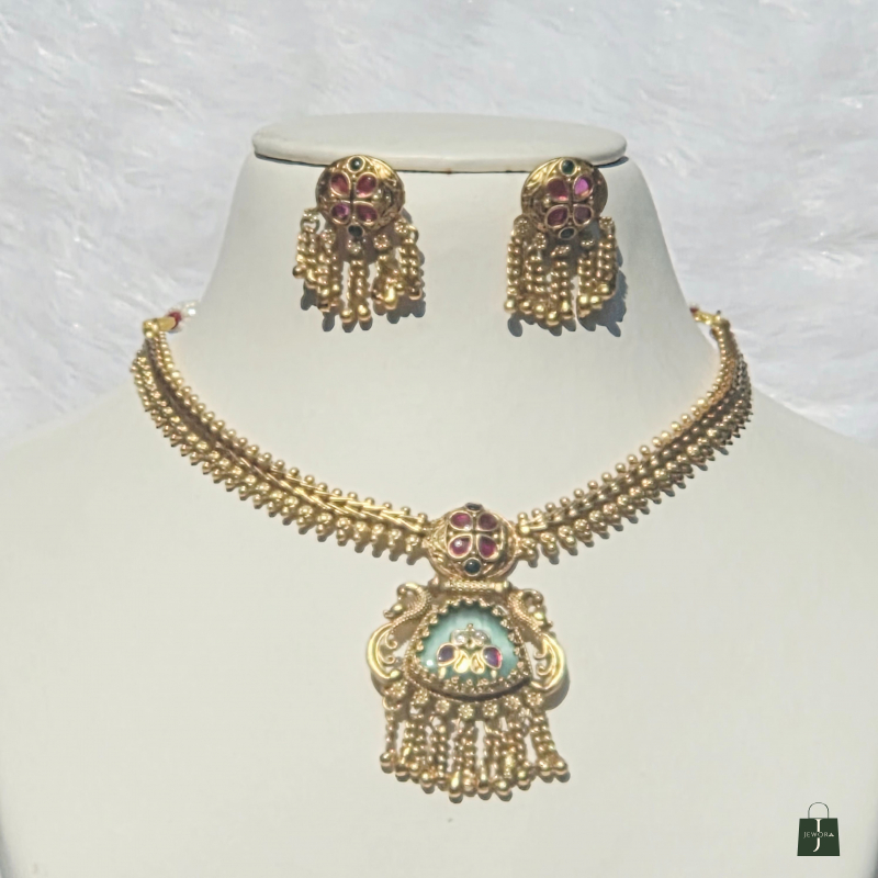 Elegant Temple Design: Inspired by traditional Indian temple jewelry, featuring intricate floral motifs and rich detailing.