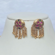 Stone & Bead Work: Adorned with pink stones, a sea-green centerpiece, and delicate gold bead danglers for graceful movement.