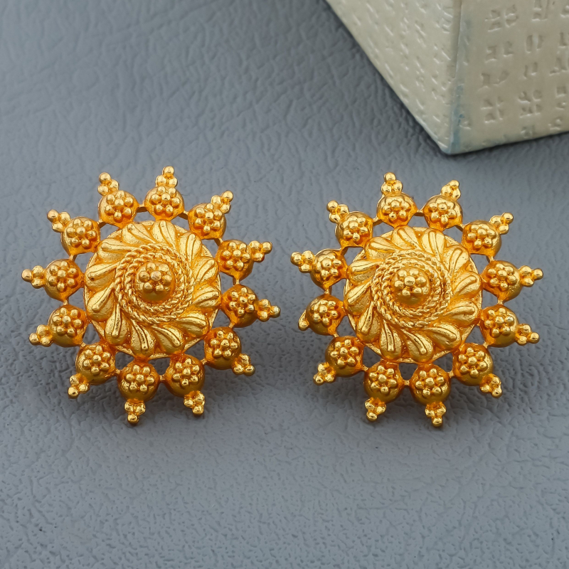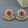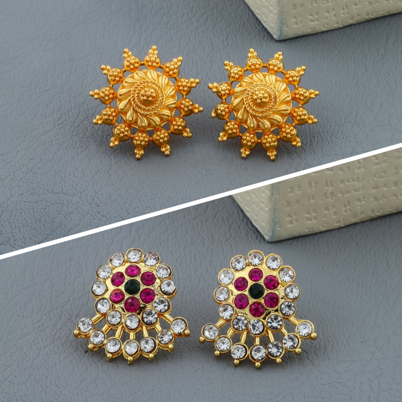 This elegant combo set features two pairs of traditional gold-tone stud earrings. The first pair showcases a classic sunburst textured design with intricate detailing, while the second pair features sparkling white stones with pink and green accent stones in a floral circular pattern. These versatile earrings are perfect for festive occasions, traditional wear, and daily ethnic styling.