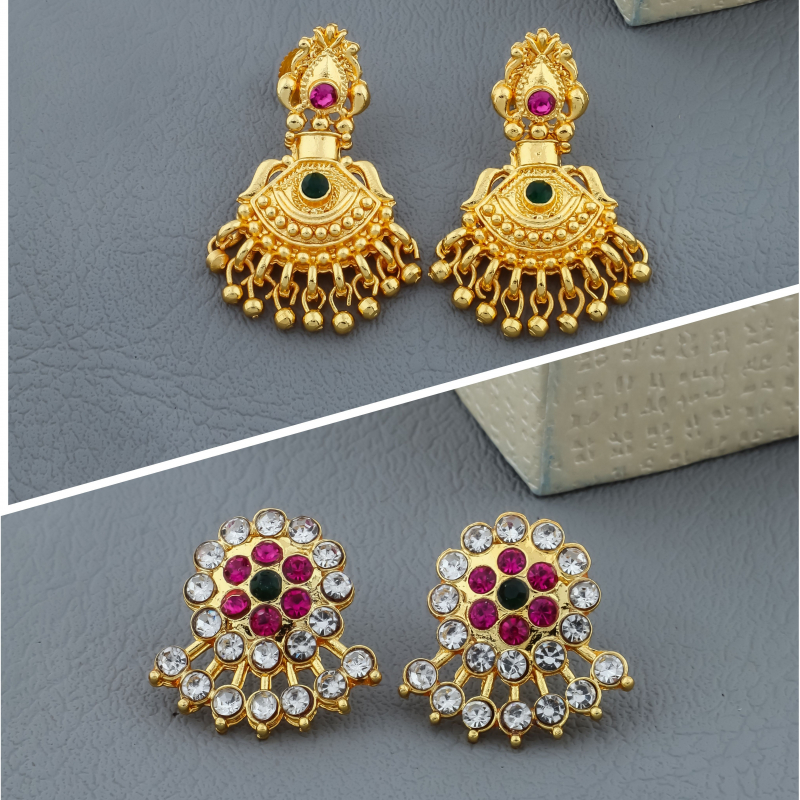 Add elegance to your jewellery collection with this beautiful 2-pair earrings combo set featuring traditional drop earrings and floral stone stud earrings. Designed with a rich gold-tone polish and sparkling artificial stones, this combo perfectly blends classic ethnic craftsmanship with modern style. Lightweight and stylish, these earrings are ideal for festive occasions, weddings, parties and daily ethnic wear.