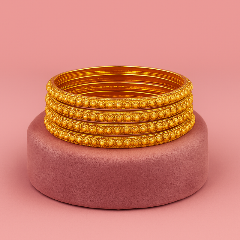 Add timeless elegance to your look with this beautifully handcrafted gold-toned temple bangle. The intricate circular embossed detailing across the circumference reflects fine artistry and traditional charm. Crafted to resemble antique temple jewelry, this bangle radiates sophistication with a subtle sheen, making it ideal for festive, wedding, and cultural occasions. Its lightweight yet durable design ensures comfort while wearing, while the rich gold polish adds a royal touch to any attire. Whether paired with sarees, lehengas, or festive ensembles, this classic bangle will perfectly complement your jewelry collection. A perfect accessory for women who admire ethnic craftsmanship and want to keep tradition alive in modern fashion.