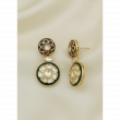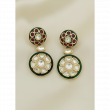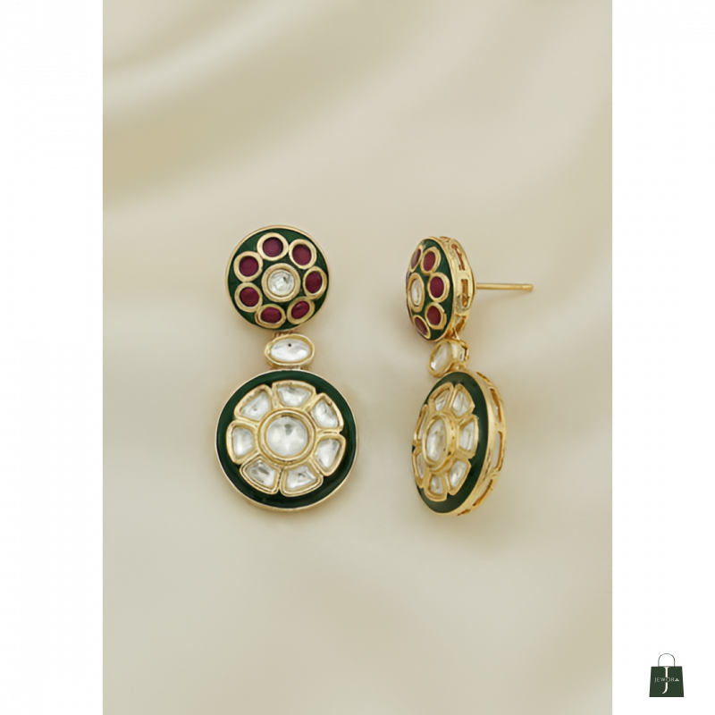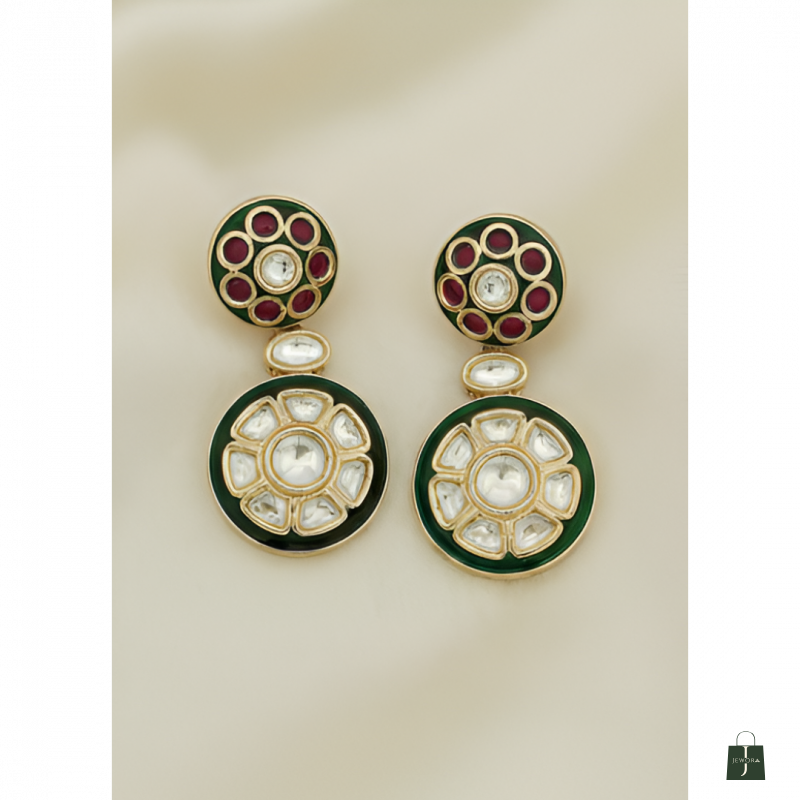 Design: Elegant circular motif design featuring alternating green and ruby enamel medallions adorned with pearls and Kundan work. The matching two-tier drop earrings showcase the same stunning combination of colors and craftsmanship.