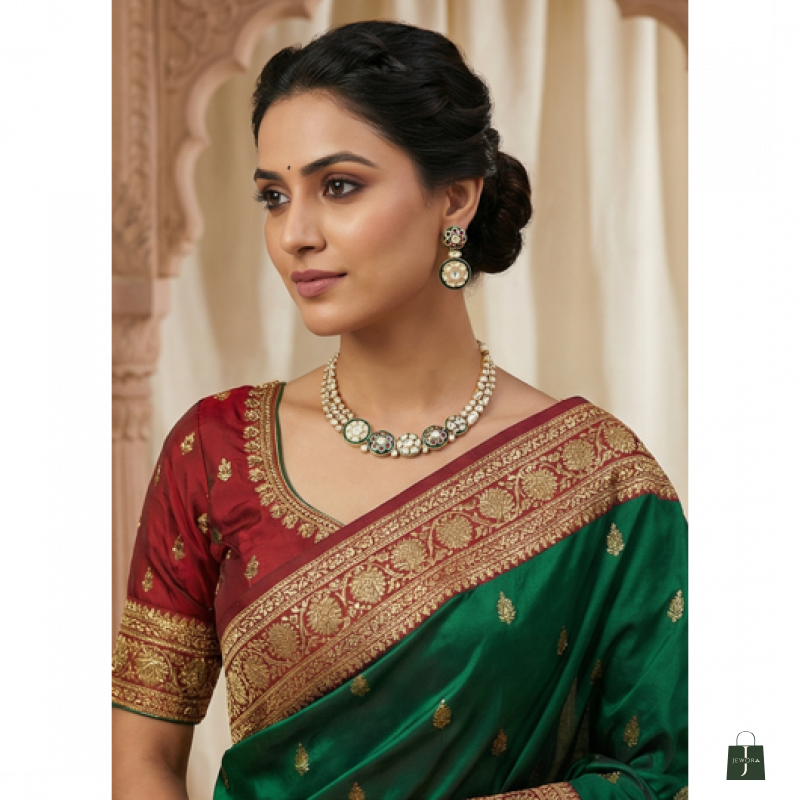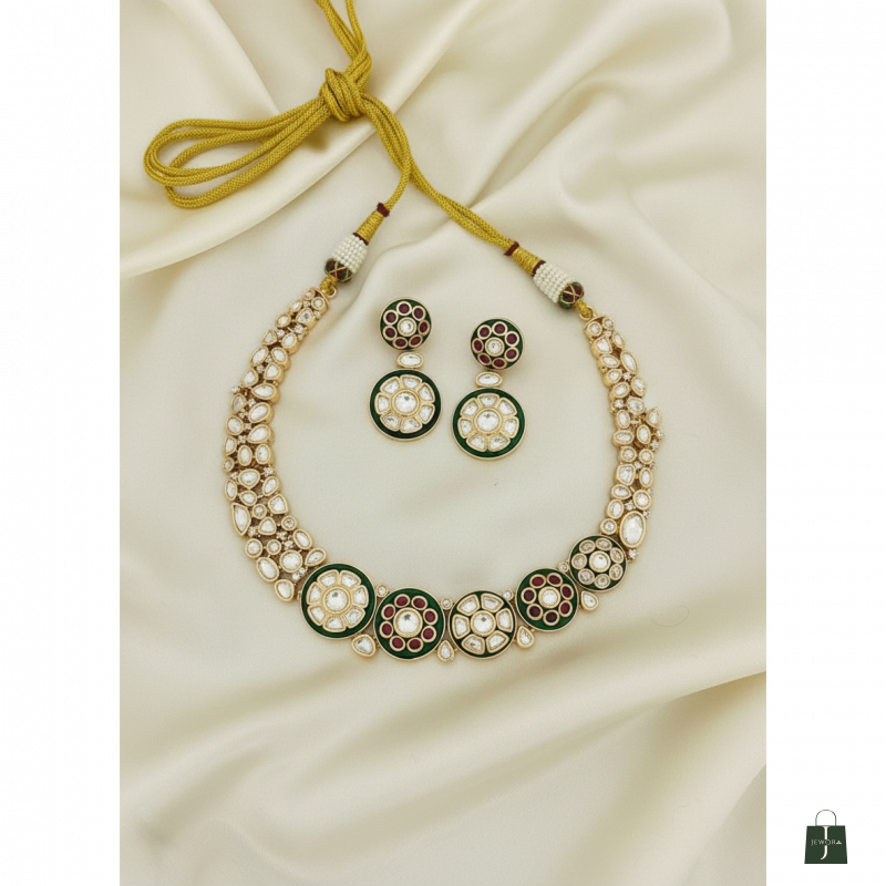 Elevate your ethnic look with this Traditional Moissanite Kundan Pearl Necklace & Earrings Set. This exquisite imitation jewellery set features intricate Kundan craftsmanship with striking green enamel work, perfect for weddings and festive occasions.