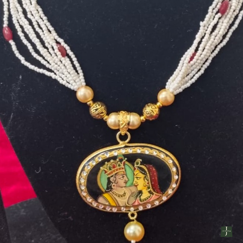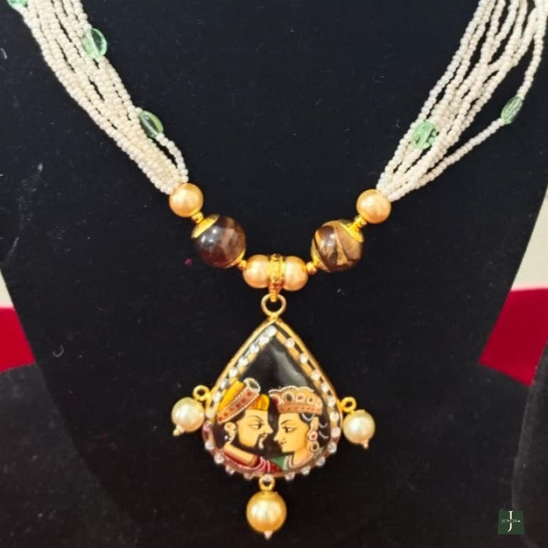 This jewelry set is a traditional Indian hand-painted pendant necklace, strongly inspired by Rajasthani miniature art aesthetics.