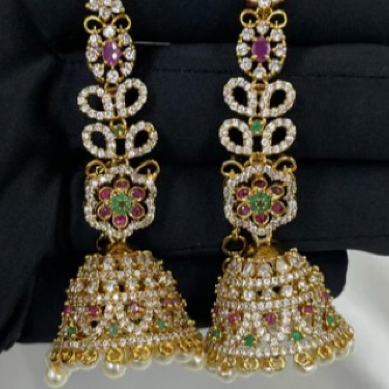 Elegant Traditional Jhumka Earrings crafted with intricate detailing and vibrant stone accents. Featuring a beautifully designed top with floral motifs and a classic pearl-studded jhumka drop, these earrings add a rich and graceful touch to any outfit. Perfect for weddings, festive occasions, and ethnic celebrations.