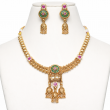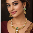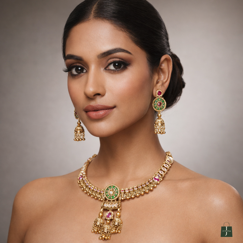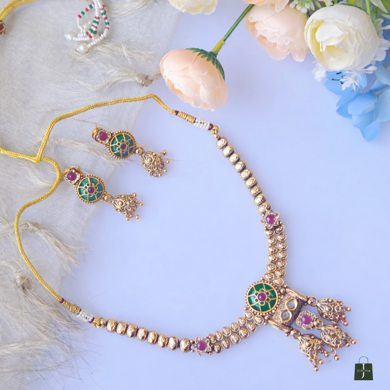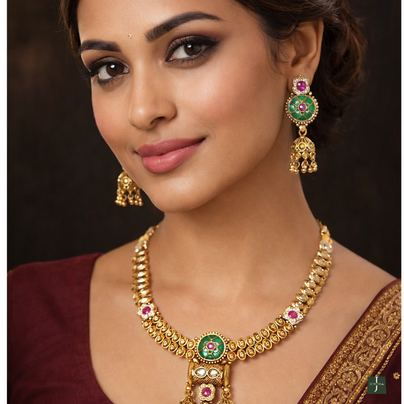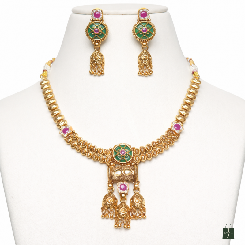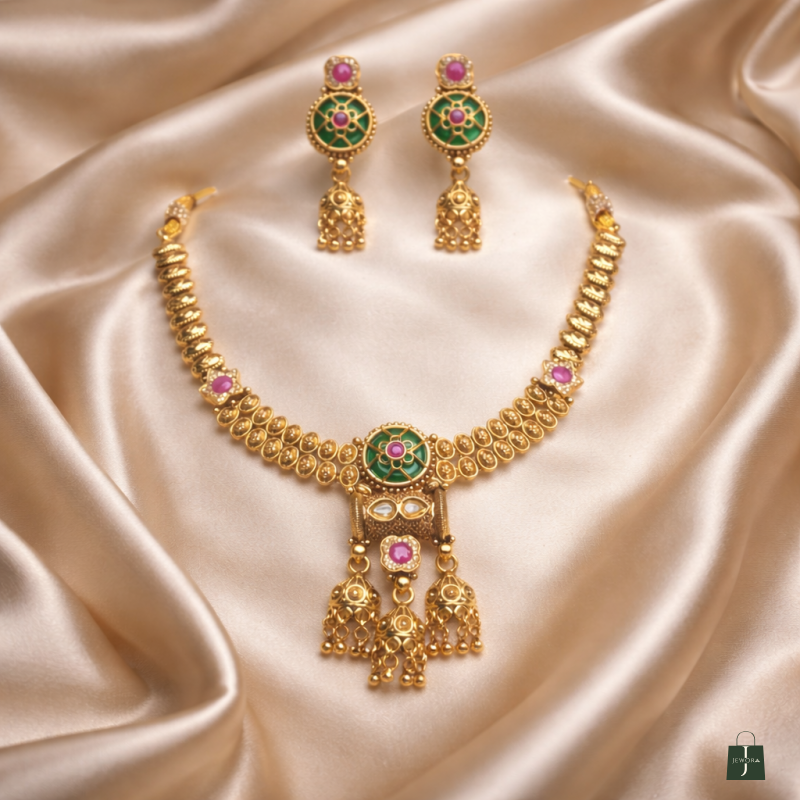 Elevate your ethnic elegance with this Traditional Gold Plated Kundan Meenakari Necklace Set, beautifully crafted to reflect timeless Indian artistry. Designed in a classic temple jewellery style, this exquisite necklace set features rich green meenakari enamel work, highlighted with pink stone accents and intricate gold-tone detailing that adds royal charm to every look.