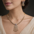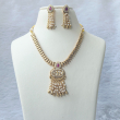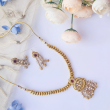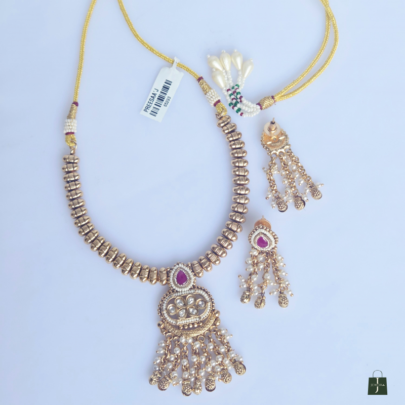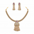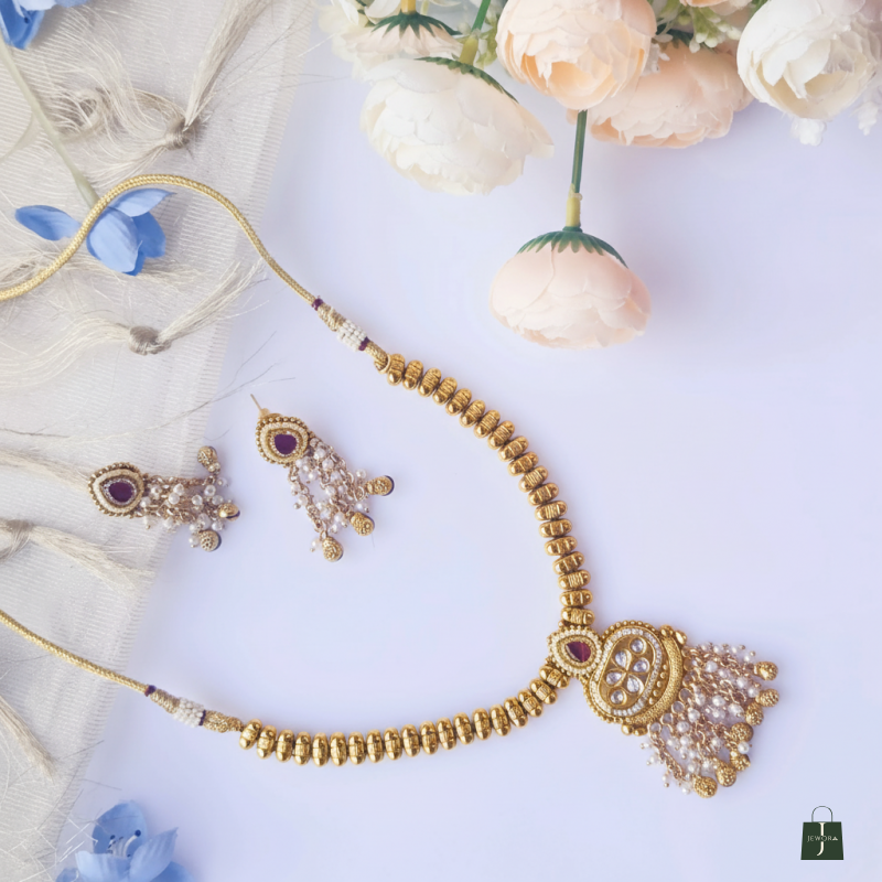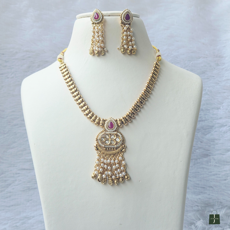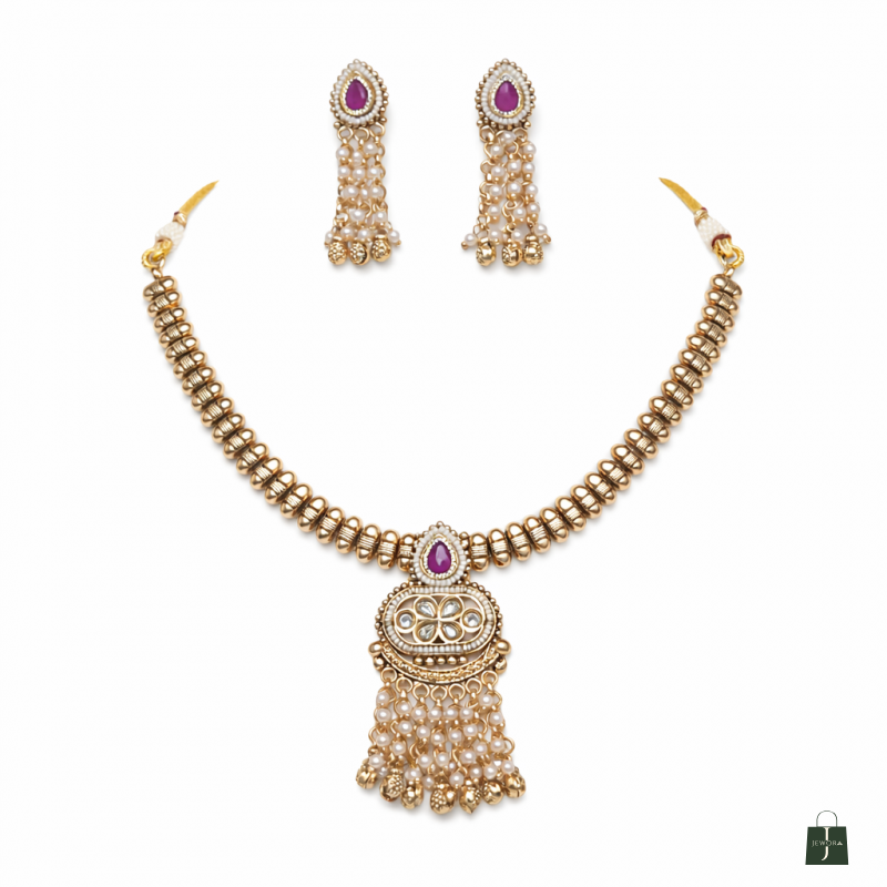 Add timeless elegance to your ethnic jewellery collection with this Traditional Gold Plated Kundan Pearl Necklace Set, beautifully crafted to enhance your festive and bridal looks. Designed in a classic temple-style pattern, this necklace features a rich arrangement of gold-toned beads, a finely detailed kundan-studded pendant, and graceful pearl drop hangings that add royal charm and movement.