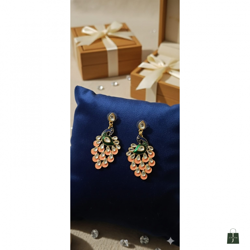 These are exquisite, handcrafted ethnic earrings that blend traditional Indian artistry with contemporary pastel tones. The design features a regal peacock motif, making them a perfect statement piece for weddings, festivals, and special occasions.