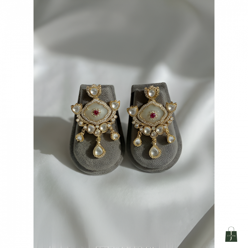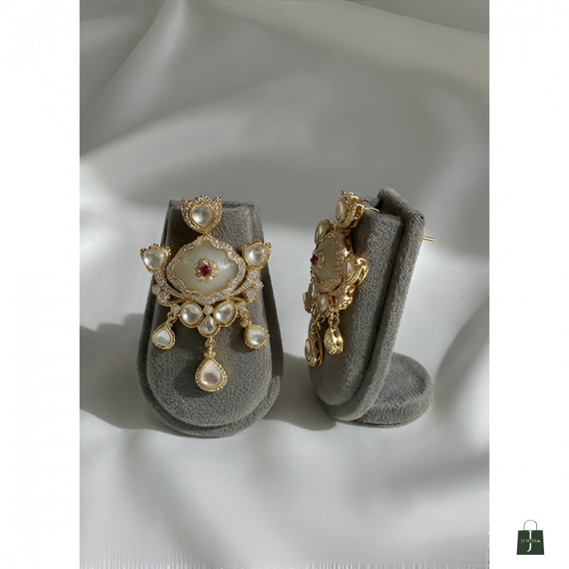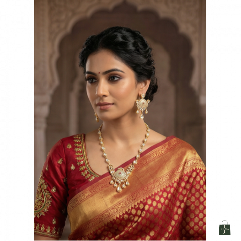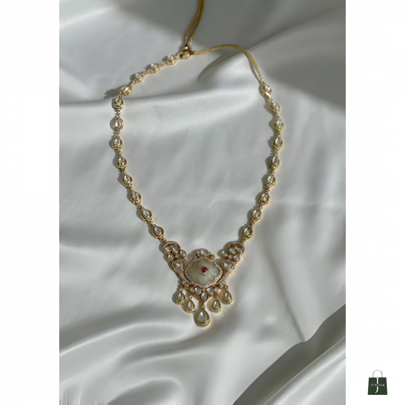 Design Features:The necklace features a classic pendant design with a prominent Mozonite centerpiece surrounded by intricate Kundan work and pearl detailing. The matching earrings mirror the same design elements with beautiful pearl drops, creating a cohesive and harmonious look. The ornate floral-inspired pattern adds femininity and grace to the overall aesthetic.