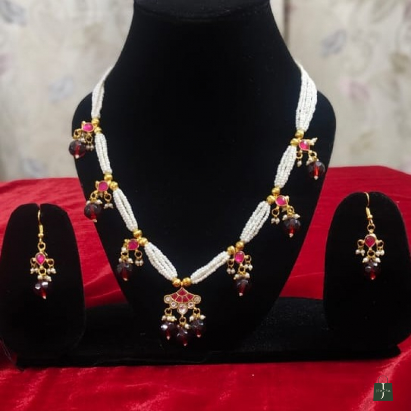 This set blends pearl elegance with traditional ruby-toned embellishments, creating a refined statement piece rooted in Indian heritage styling.
